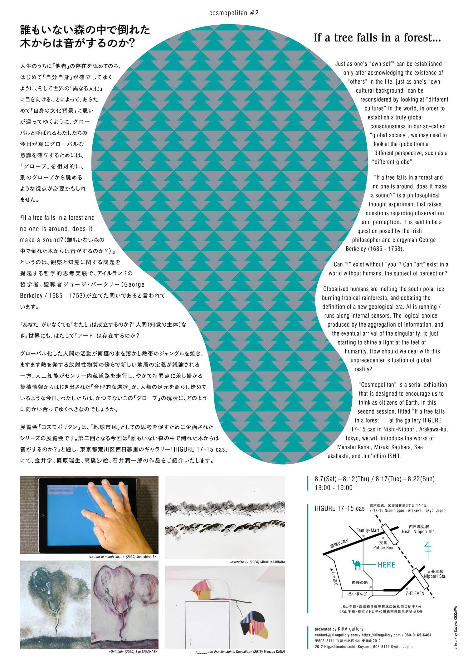 人生のうちに「他者」の存在を認めてのち、はじめて「自分自身」が確立してゆくように、そして世界の「異なる文化」に目を向けることによって、あらためて「自身の文化背景」に思いが巡ってゆくように、グローバルと呼ばれるわたしたちの今日が真にグローバルな意識を確立するためには、「グローブ」を相対的に、別のグローブから眺めるような視点が必要かもしれません。 『If a tree falls in a forest and no one is around, does it make a sound?(誰もいない森の中で倒れた木からは音がするのか?)』というのは、観察と知覚に関する問題を提起する哲学的思考実験で、アイルランドの哲学者、聖職者ジョージ・バークリー(George Berkeley / 1685 - 1753)が立た問いであると言われています。「あなた」がいなくても「わたし」は成立するのか?「人間(知覚の主体)なき」世界にも、はたして「アート」は存在するのか? グローバル化した人間の活動が南極の氷を溶かし熱帯のジャングルを焼き、ますます熱を発する放射性物質の傍らで新しい地層の定義が議論される一方、人工知能がセンサー内蔵道路を走行し、やがて特異点に差し掛かる集積情報からはじき出された「合理的な選択」が、人類の足元を照らし始めているような今日、わたしたちは、かつてないこの「グローブ」の現状に、どのように向かい合ってゆくべきなのでしょうか。 展覧会『コスモポリタン』は、「地球市民」としての思考を促すために企画されたシリーズの展覧会です。第二回となる今回は『誰もいない森の中で倒れた木からは音がするのか?』と題し、東京都荒川区西日暮里のギャラリー「HIGURE 17-15 cas」にて、金井学、梶原瑞生、高橋沙絵、石井潤一郎の作品をご紹介いたします。
