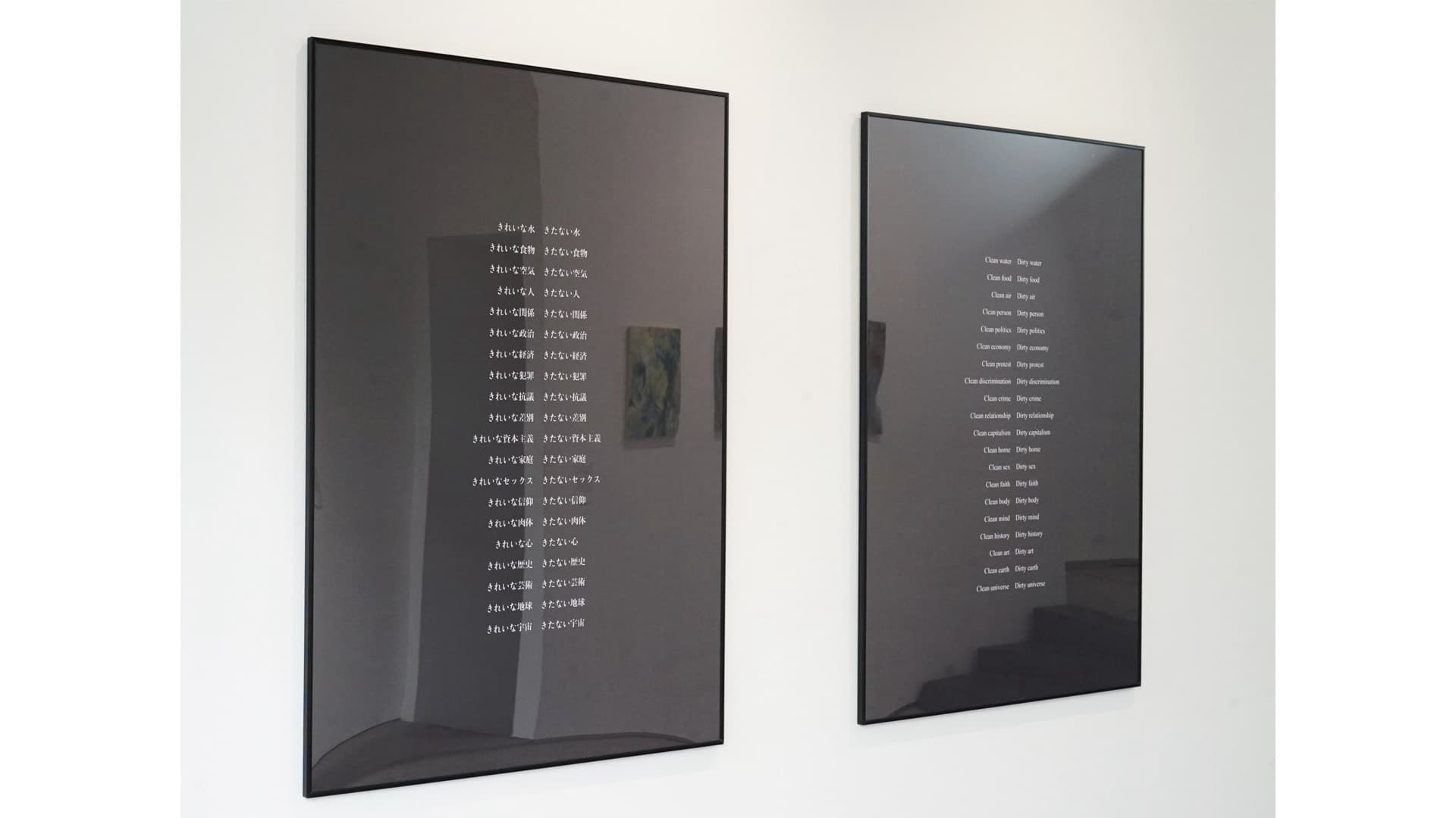 岩井優のパネル作品は「きれい」や「きたない」といった価値判断をさまざまな対象に機械的に結びつけることによって、わたしたちの社会に無意識に内在する分類の構造を浮かび上がらせます。