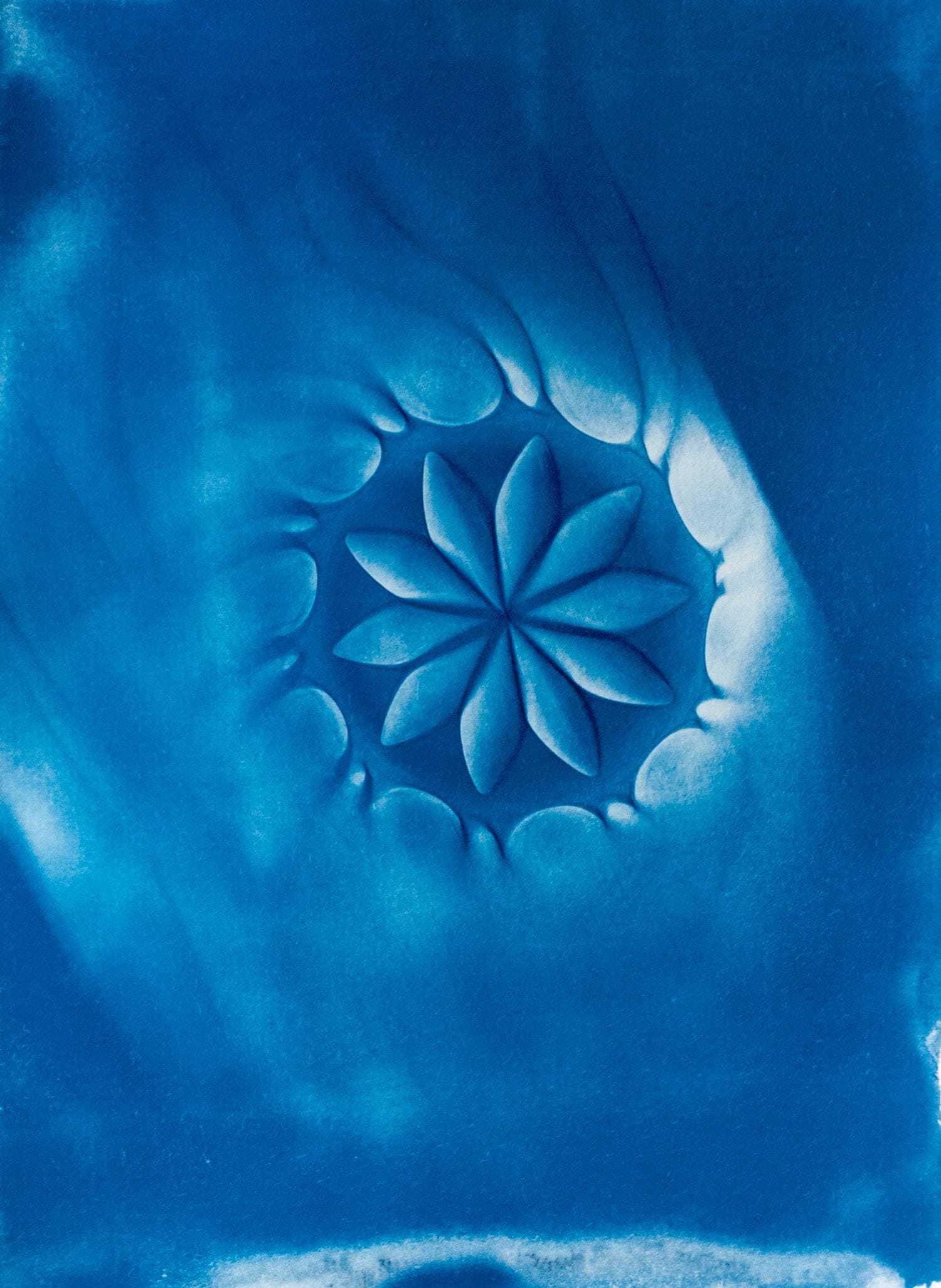 最初のシリーズは、彼の最新作であるサイアノタイプの作品です。サイアノタイプは、天文学者ジョン・ハーシェルによって1842年に発明された最も古い写真技法の一つで、写真の先駆者として世界初の「写真集」を出版した英国の植物学者アンナ・アトキンスが好んで使用したものです。アンナ・アトキンスが自然界を調査したのに対し、スンドハイムは文化的な「オブジェ」の視覚的研究に集中しています。