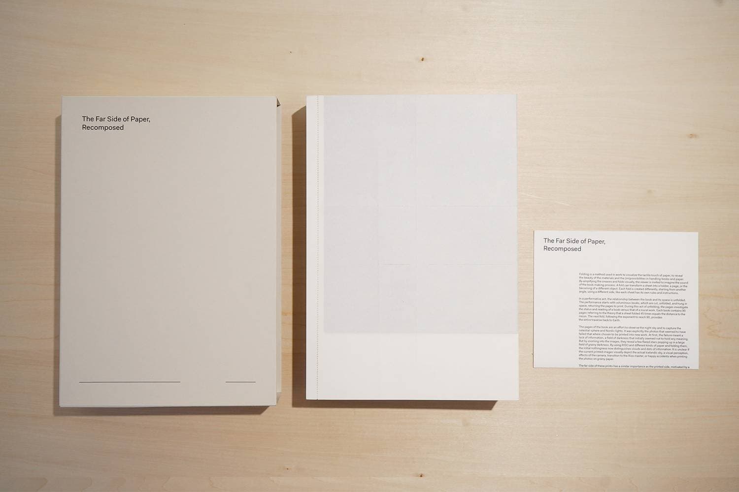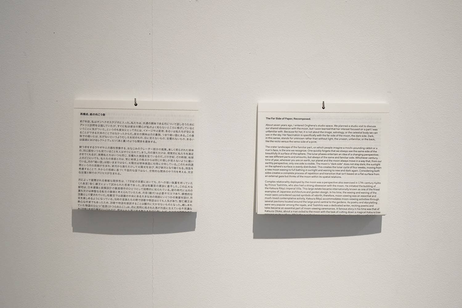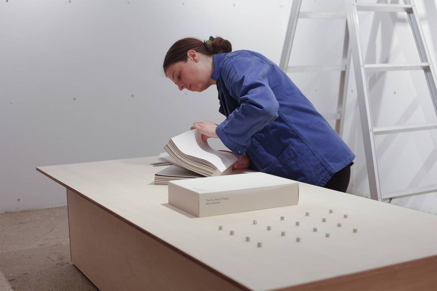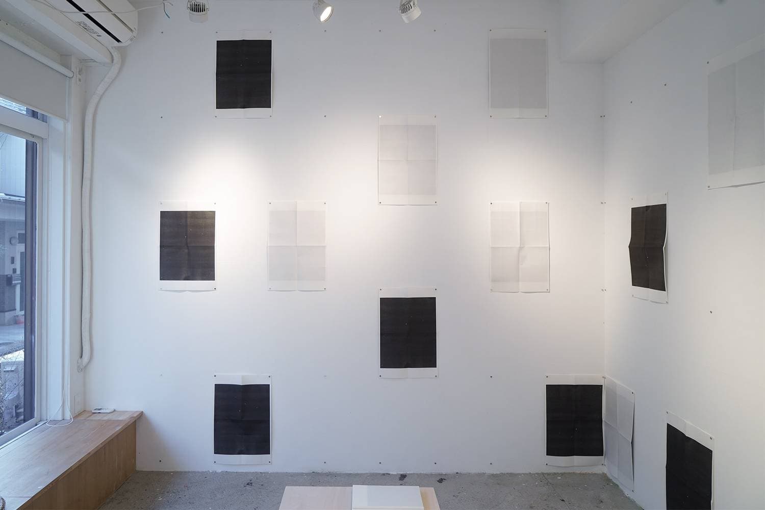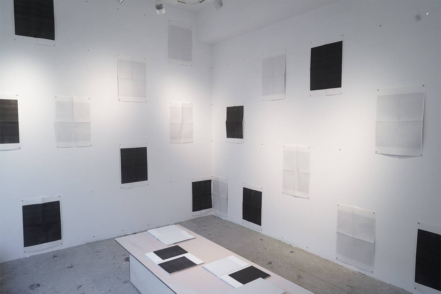 黒という色と、アート・オブジェとしての本に絶大な魅力を感じるアン・オンヘナは、その両面に触れる展覧会を行います。パフォーマンスを通して作品を設置するオンヘナは、本を解体し、空間へと展開し、壁画の作品へと変化させます。折り畳まれた本のページには、まるで月のように表面とその向こう側:レクトとヴェルソ(右の頁と左の頁)つまり、既知の面と未知の面があります。
